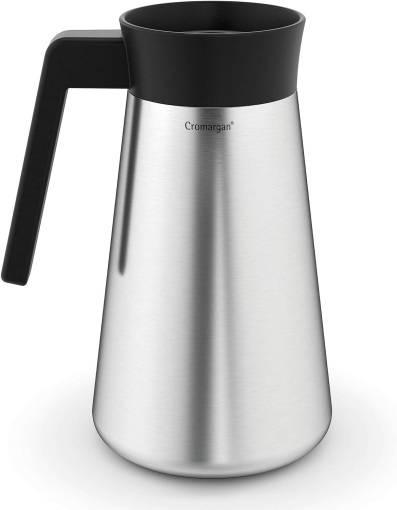 Die Maschine kommt mit zwei Kannen: Einer normalen schmalen Kanne mit Henkel und Druckverschluß, die aus Chromagan hergestellt ist und einem Becher für unterwegs, ebenfalls aus Chromagan. Da kann man nicht meckern. Den To-Go-Becher habe ich bis jetzt nicht gebraucht, macht jedoch den gleichen Eindruck wie die "normale" Kanne.